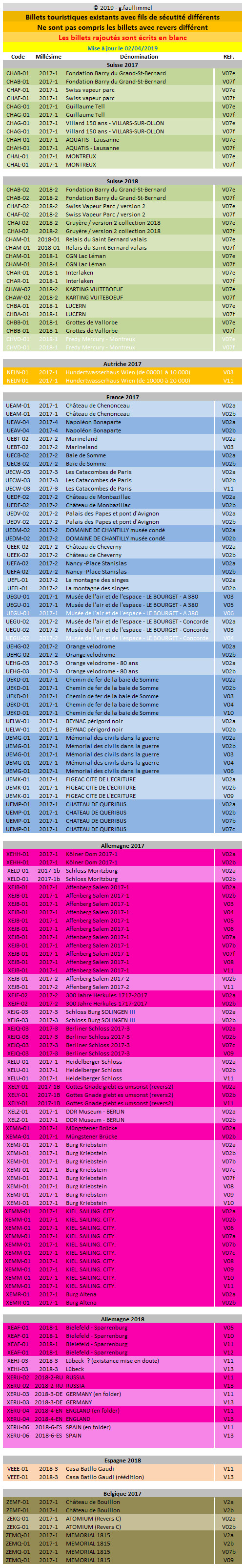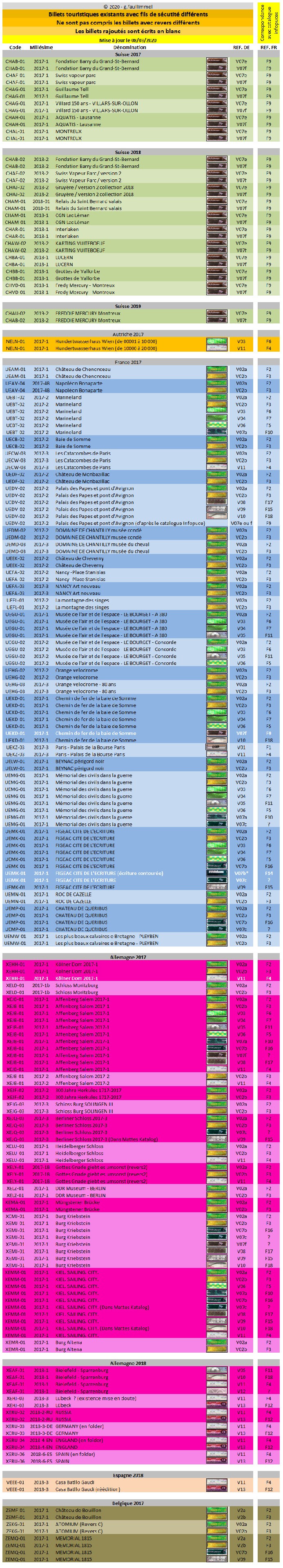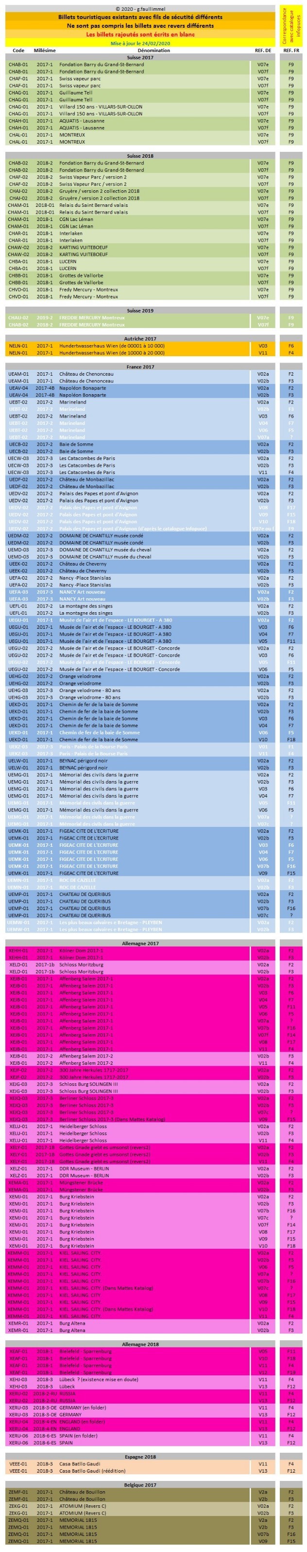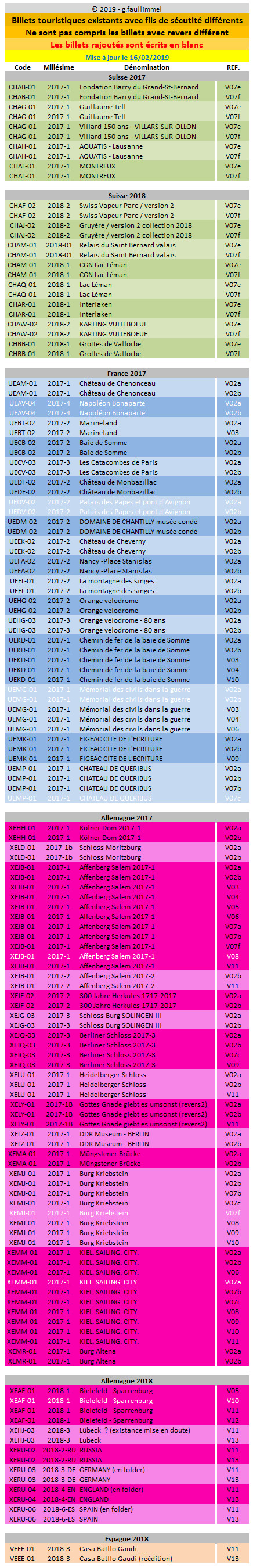 Comme promis, voici la liste mise à jour au 08/03/2020 des billets existants avec fils de sécurité différents