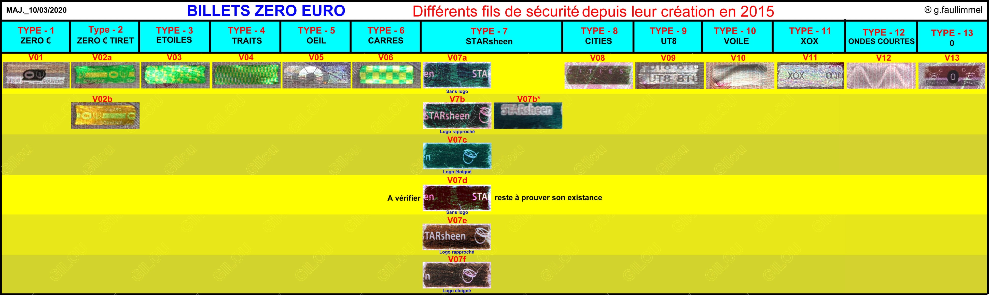 Voici les différents fils de sécurité trouvés sur des billets Touristiques Zéro Euro depuis leur création en 2015. J'ai fait cette recherche et créé ce tableau conjointement avec des amis collectionneurs allemands sur tous les billets touristiques zéro euro sortis à ce jour depuis leur création, tous pays confondu et cela jusqu'à la date mise à jour de ce tableau.