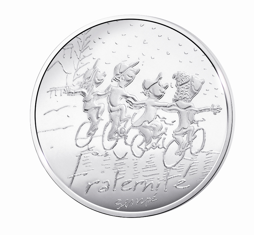 Pour la 2e année, la Monnaie de Paris met à l’honneur les valeurs fondamentales de la République, et particulièrement la devise française, inscrite au fronton de tous les édifices publics: « LIBERTE, EGALITE, FRATERNITE ». Complétées par la valeur universelle qu’est la PAIX, toutes ces valeurs sont réunies en une seule pièce, la RÉPUBLIQUE, qui les incarne toutes. Joyeux, irrévérencieux, poétique, rêveur, observateur du quotidien : tous ces qualificatifs peuvent être associés à Sempé, l’artiste avec lequel la Monnaie de Paris a choisi de collaborer pour cette 2e année. Son regard tendre et affuté sur la vie de tous les jours font de ses dessins un éclat de rire lucide sur l’ordinaire de chacun de nous. Avec respect mais sans à priori, il offre sa vision des valeurs de LIBERTE, EGALITE, FRATERNITE, PAIX et REPUBLIQUE, de façon attachante et perspicace.