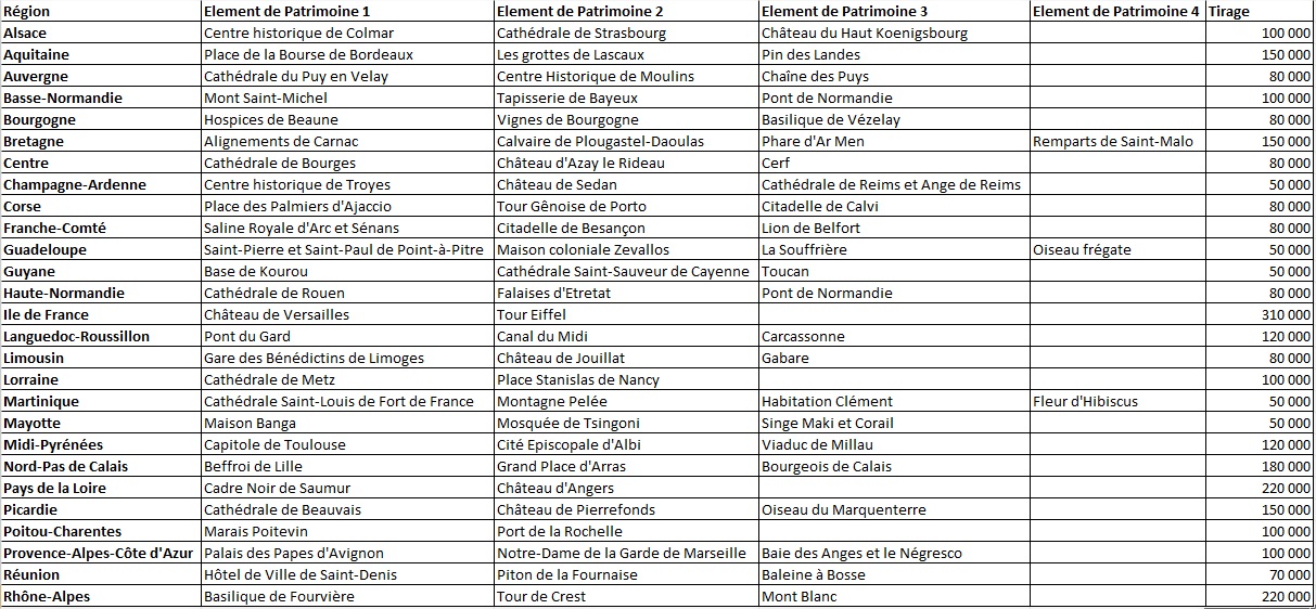 Sinon, commentaire sur les pièces elles-mêmes (outre le fait déjà dit qu'elles font un peu "toc") : Mettre jusqu'à 4 éléments de patrimoine sur à peine 1/3 de pièce ! pas étonnant qu'on ne distingue par grand chose sur bon nombre de régions !